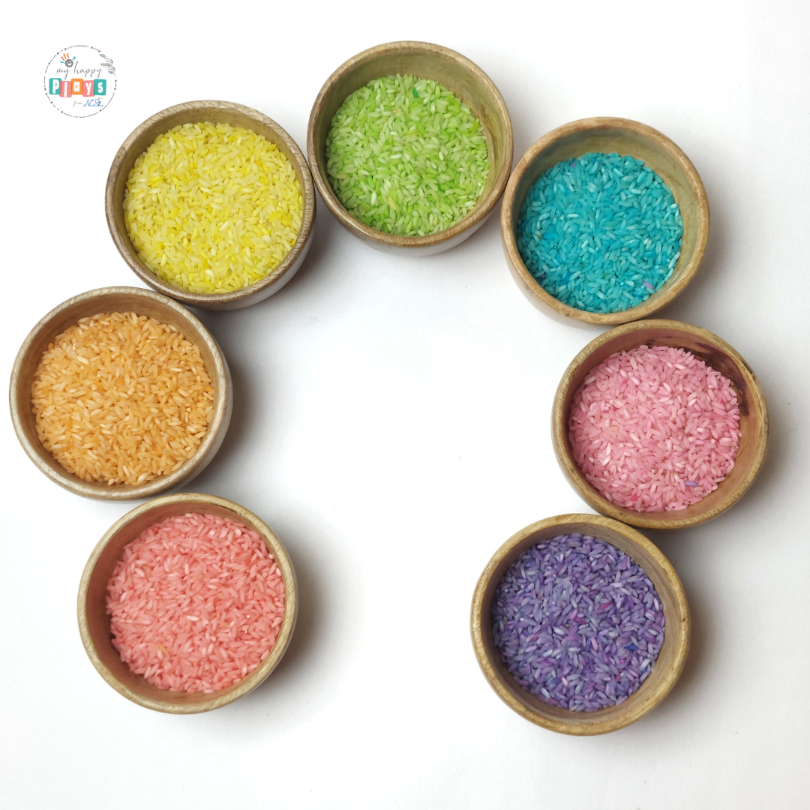 How to play with coloured rice : Pouring,scooping.