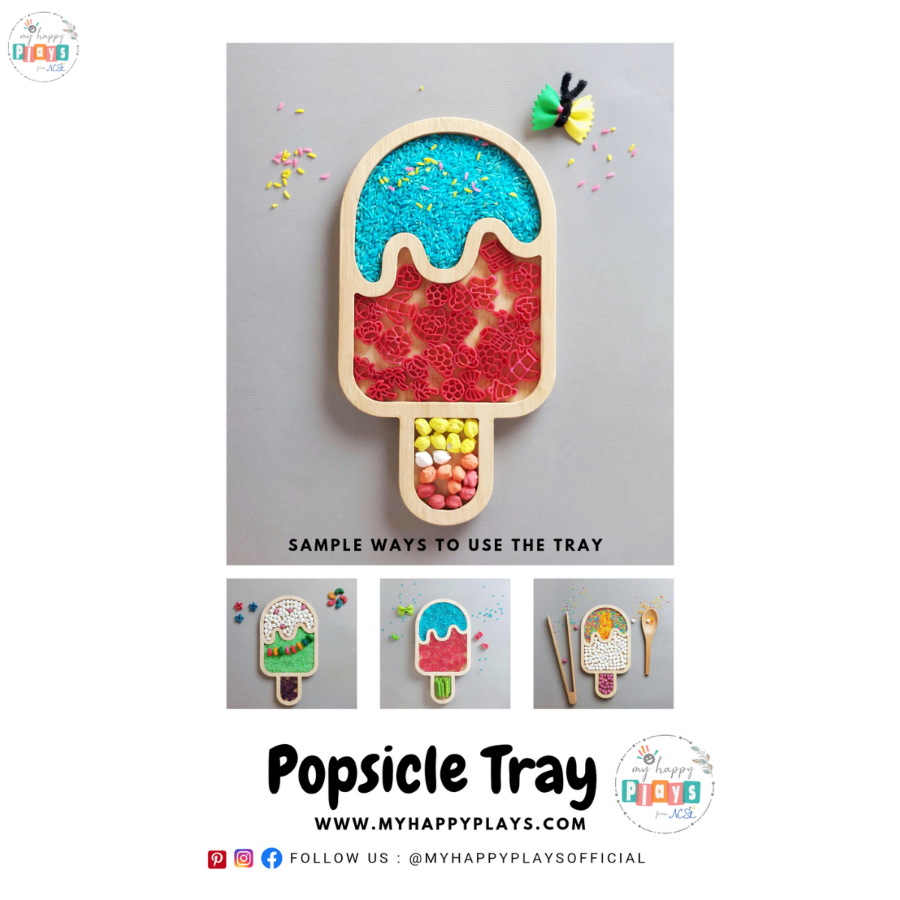 POPSICLE Concept tray (with prompt sheet) And Fillers: Our favourite sweet treat in the form of a playtool and would any child stop playing with them! Fillers are given includes: Blue Rice Sprinkle Rice (Pink and Yellow Mix) Toy character pasta Tube shaped pasta Concept Butterfly pasta Chickpeas Pipe cleaner Tray size for Popsicle tray size: 25.5 cm total 19cm ice cream part 6.5 cm stick part The Popsicle Concept trays are designed to provide opportunity to create artsy fun with sensory materials. Fillers are used to color the trays and each color concept used will simulate a true Cupcake and will be a delight to watch the end result. We provide Prompt sheet along so the child can recreate the trays with help. The last image is to show a variation. Fillers in that image may or may not be included. One can buy a range of fillers from the tray filler section.