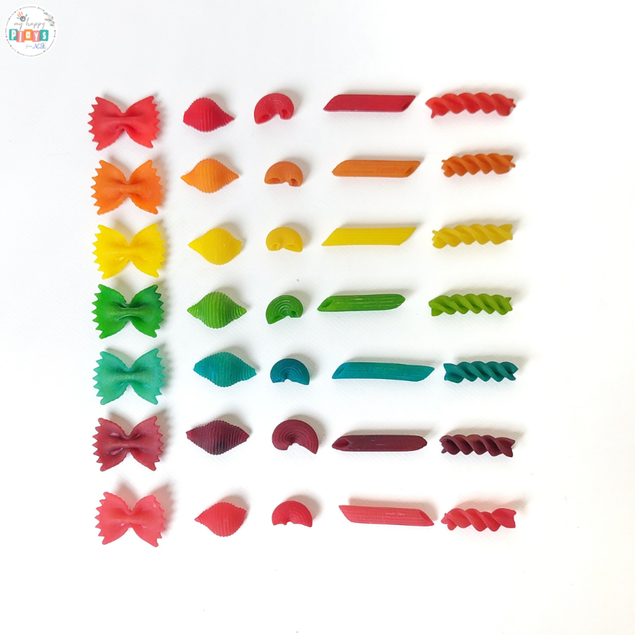 Sensory Pasta has various shapes, colors to learn Color Classification, Shape sorting with additions like Pipe Cleaners to string a Pasta necklace .. make a Pasta braclet etc. playfully learning mastering fine motor skills...