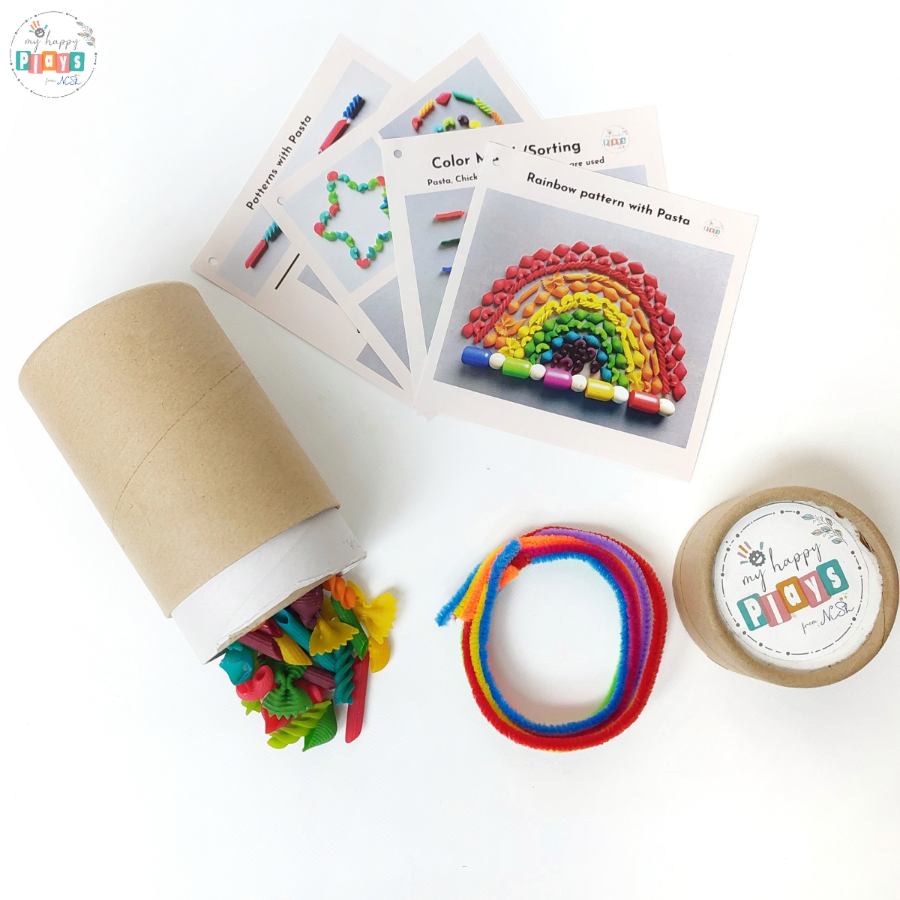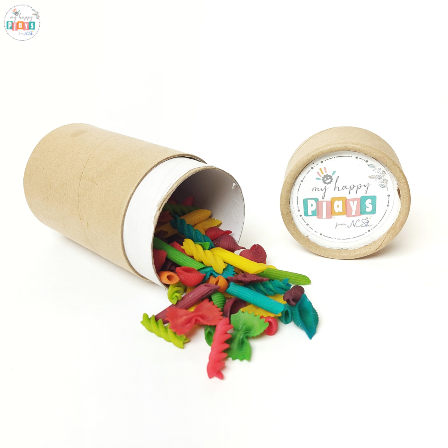 Rainbow Sensory Pasta Is Made From Edible Materials Like Pasta Of 5 Shapes, Vinegar And Edible Food Colors. Lab Tested And Is Nontoxic. They Come Papertube Container And Pipe Cleaners Are Used For Lacing Activies With Pasta. 4 Activity Sheets / Prompt Sheets Are A Part Of This Kit For The Child To Recreate Them.