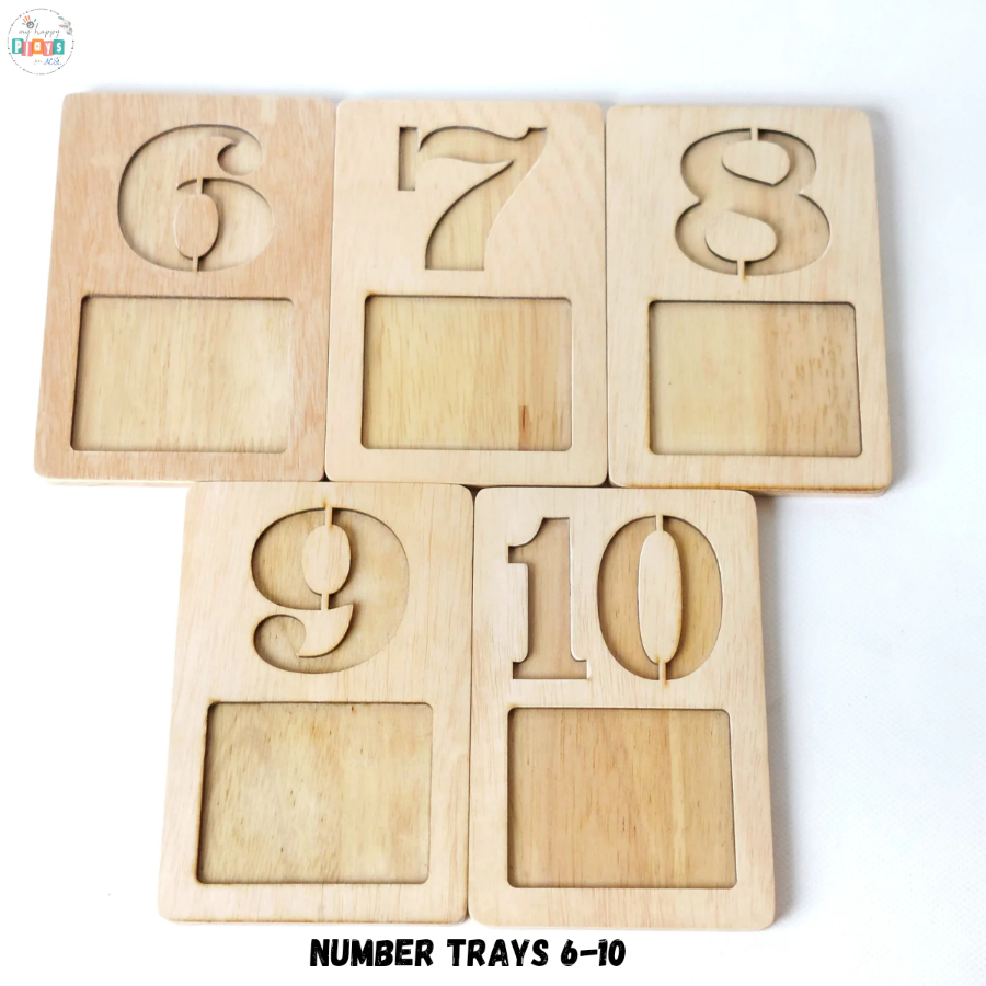 Children Learn numbers by tracing and filling the sockets and adding any filler on the tray as the number. If one is psent, one object will be placed in the plate.